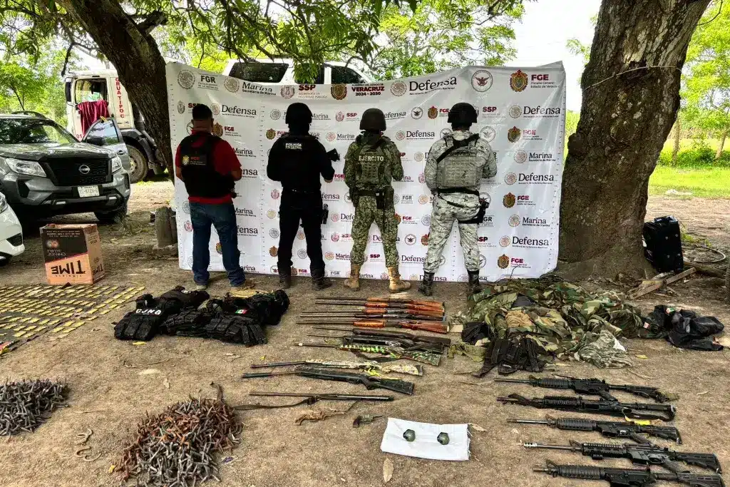 “En las primeras horas de esta mañana en una operación interinstitucional, personal del Ejército Mexicano, Guardia Nacional, SEMAR, FGR, FGE y SSP del Estado de Veracruz, aseguró armas de fuego, granadas, vehículos y un inmueble en la localidad de Mixtequilla, Municipio de Ignacio de la Llave, Ver.