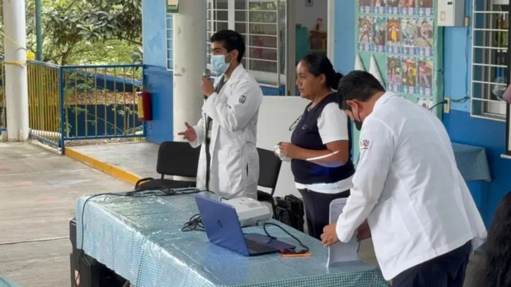 En Poza Rica, personal del sector salud se reunió con la comunidad escolar del jardín de niños Libertad, donde se confirmaron 12 casos de menores con síntomas característicos.