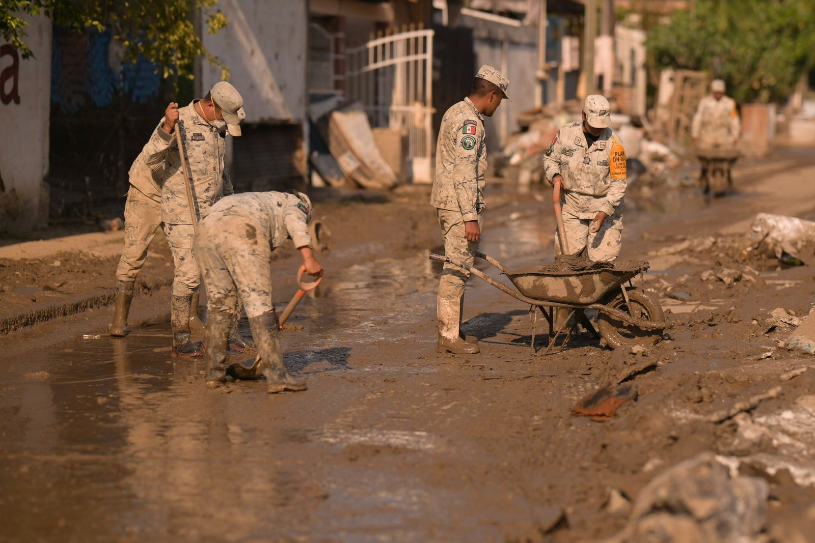 A pie y acompañada de la gobernadora Rocío Nahle y la secretaria del Bienestar, Ariadna Montiel, así como de mando del Ejército y Marina, la mandataria estuvo visitando colonias que continúan enlodadas tras las inundaciones y platicando con damnificados.